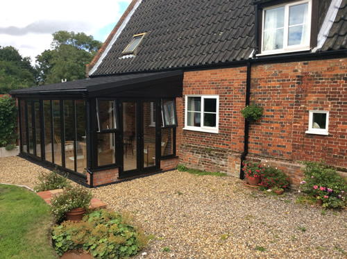 The very pale pamment floor creates a light airy feel to the conservatory while matching the traditional look of the immaculately renovated cottage.