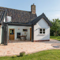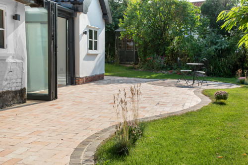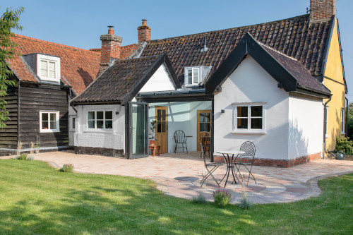 The two arms of this venerable house are bridged to make a garden room. When the folding glass panels are opened out the garden room blends into the patio and thence to the garden.